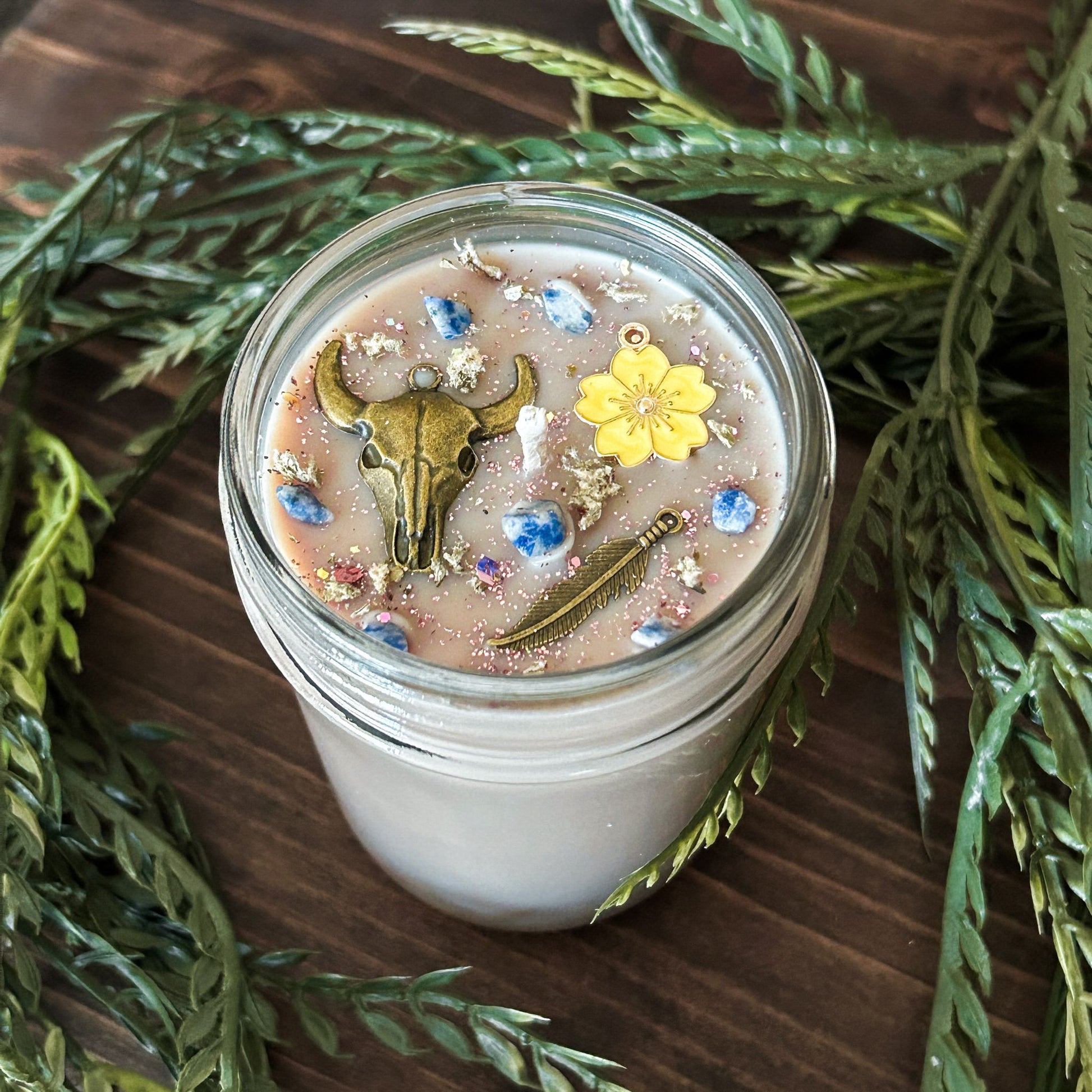 Topped with blue jasper crystals, a cow skull charm, a flower charm, a feather charm, coltsfoot leaf, and eco-friendly shimmery sparkles for an added touch.